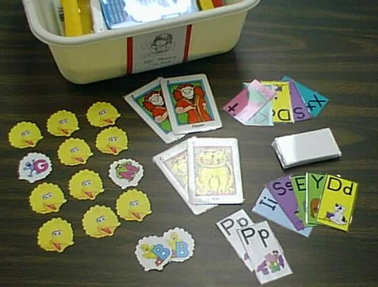 Students use the cards in the ABC Memory tub to take turns and to verbally ask their peers for cards that have the same letter and picture on them (making associations between letters and sounds).