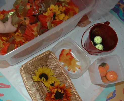 decorative leaves, mini pumpkins, mini gourds, artificial sunflower blossoms, acorns, tongs, small cloth bags, baskets, and containers of varying sizes, muffin tin or other sorting tray, etc.