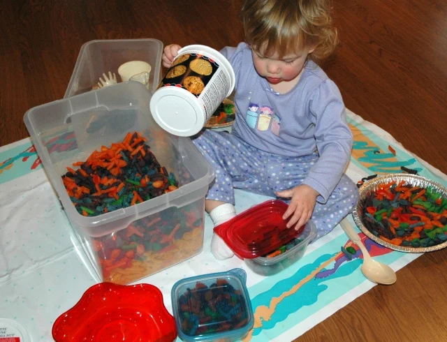 colored rice, measuring cups, wooden spoons, muffin tins, mixing bowl, funnel, small plastic bottles, etc.