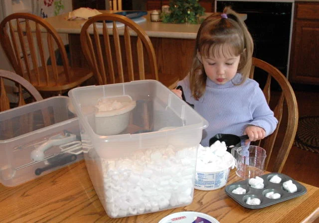 Styrofoam packing peanuts, measuring cups, muffin tins, large and small spoons, discarded food box and food cans with lids, big bowl, medium sized bowl, small bowl, etc.