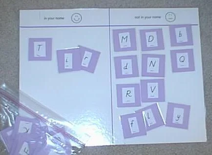 Students choose a board and the corresponding color set of letter cards. Students sort each letter by whether it is in their name or not in their name. Students may choose to have their name card in front of them while completing this task.
