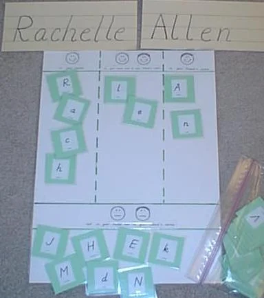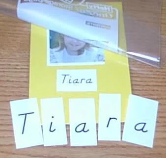 Each bag contains a photo and written name of a student. The bag also contains all of the individual letters that make up the child's name. Students choose a bag and manipulate the letters to spell their own or a friend's name.